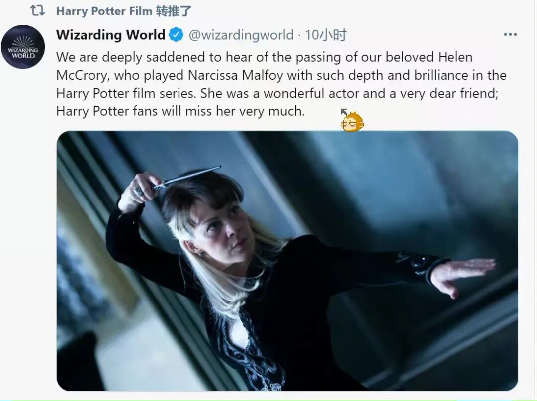 魔法世界发文缅怀,“我们对海伦·麦克洛瑞的去世深感悲痛,她在哈利波特系列电影中扮演的纳西莎·马尔福如此出色到深入人心。她是一位卓越的演员,也是一位可亲的朋友;哈利波特的粉丝们会非常想念她。”