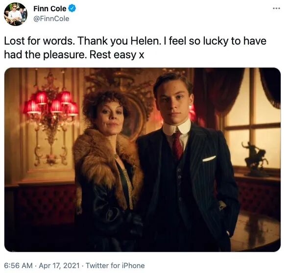 剧中波莉阿姨的儿子扮演者芬恩·科尔(Finn Cole)分享了了两人的剧照,并发文表示悼念。
