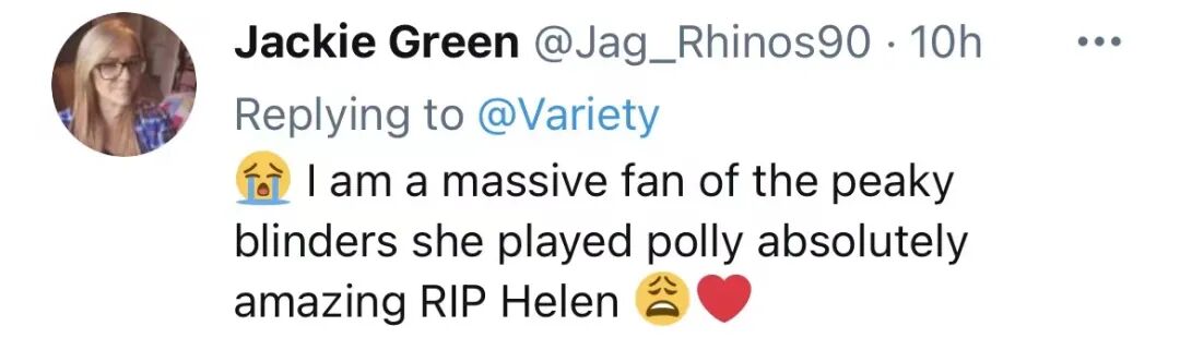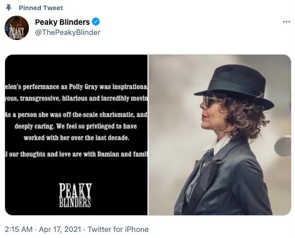 《浴血黑帮》也发推缅怀这位剃刀党谢尔比家族的大家长“波莉阿姨”。