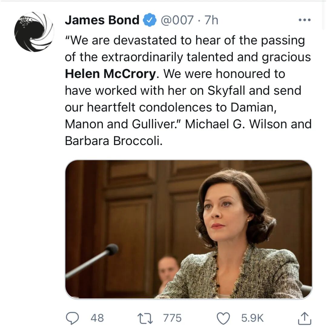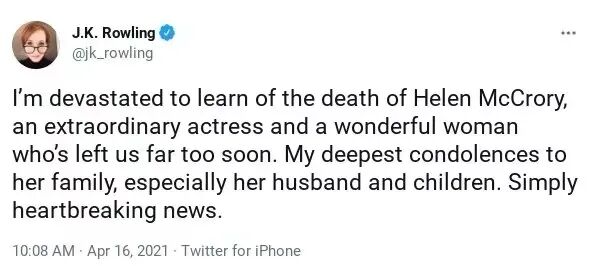《哈利·波特》小说作者J·K·罗琳:“得知海伦·麦克洛瑞去世的消息,我深感悲痛,她是一个杰出的演员、杰出的女性,离开我们太早了。”