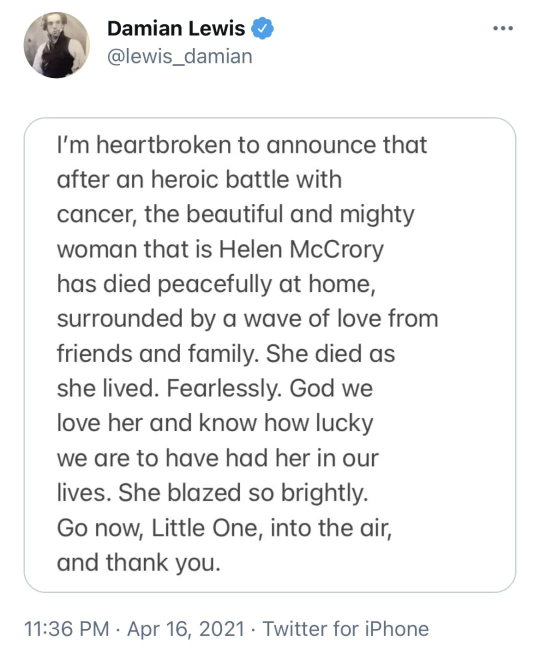昨晚,她的丈夫、曾主演《国土安全》的英国演员戴米恩·刘易斯(Damian Lewis)发推宣布了这一消息,称麦克洛瑞与癌症英勇抗争之后,在亲朋好友的爱意包围下安详离开。