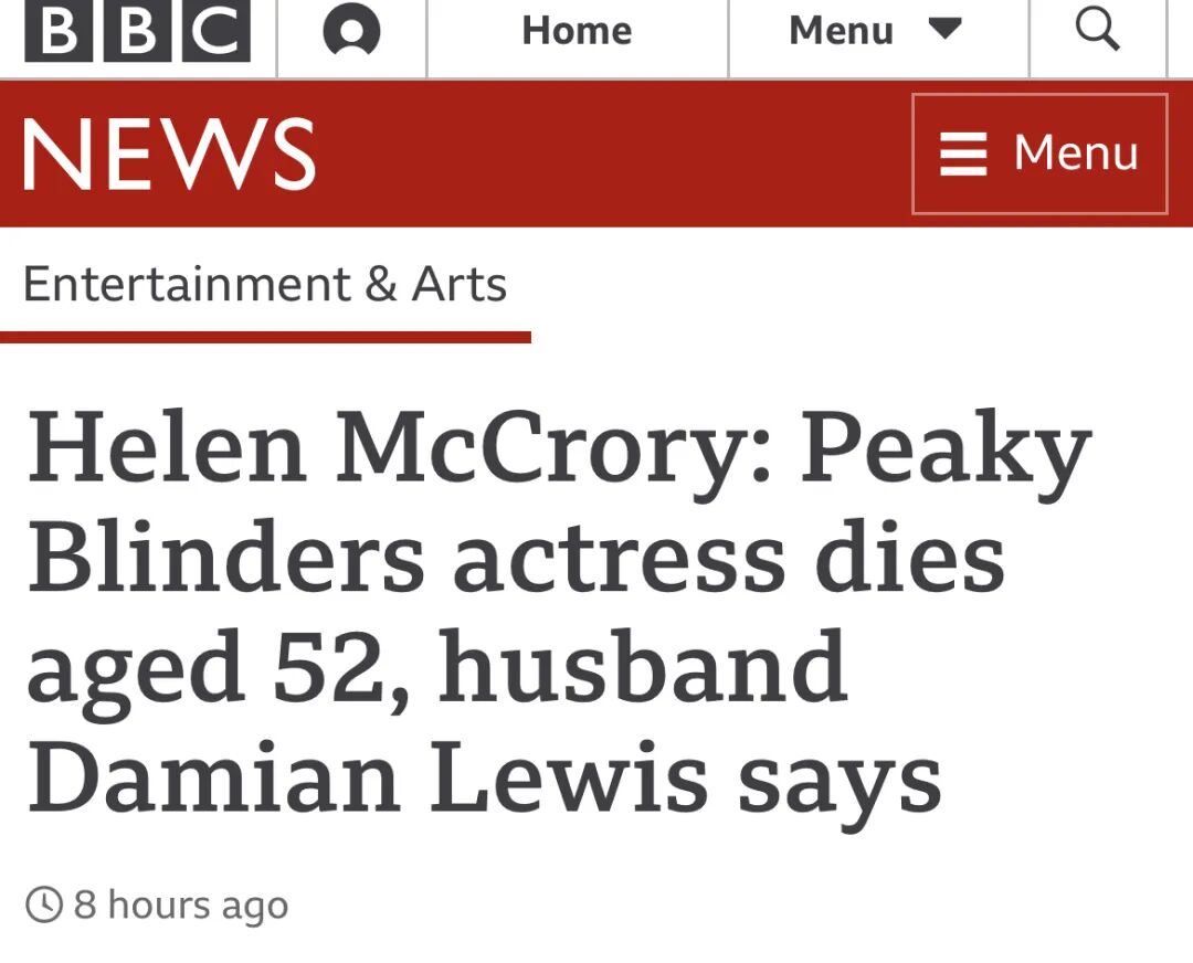 英国演员海伦·麦克洛瑞(Helen McCrory)去世,终年52岁。