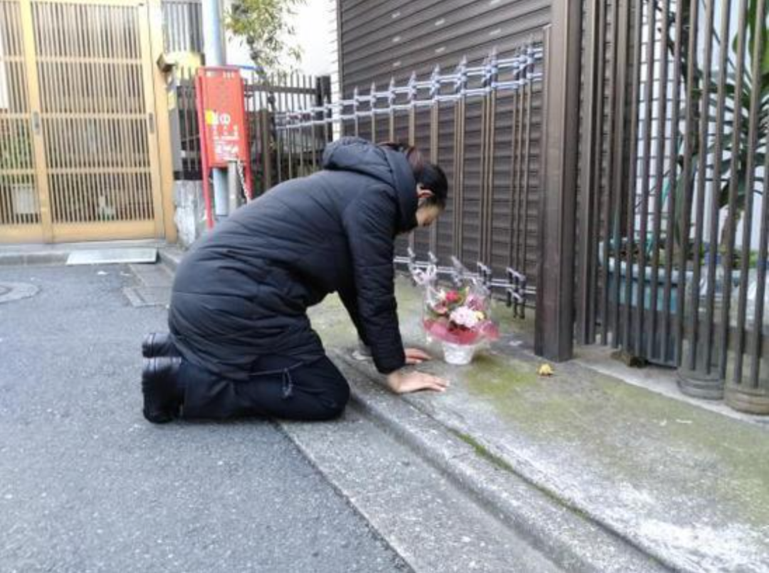 江秋莲跪在女儿生前居住的日本公寓门前悼念