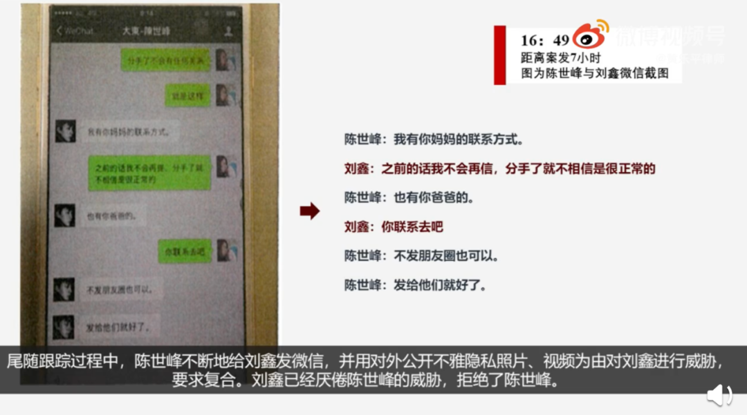 期间,陈世峰给刘鑫发骚扰微信,威胁如果不和他和好,就要公开她的不雅照片,声称有她父母的联系方式,要发给他们。