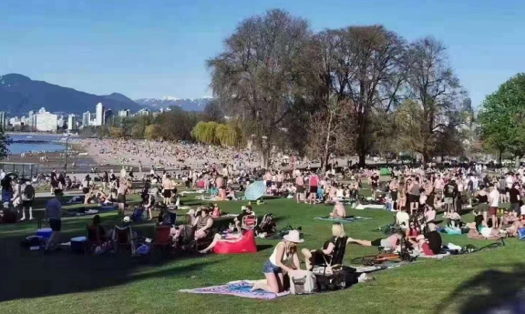 天气渐暖,公园人满为患。特别是4月18日的英吉利海滩上,密密麻麻的游客让人不得不怀疑,温哥华的卫生官员和警方是不是压根就没把每天1000多的新增放在心上。