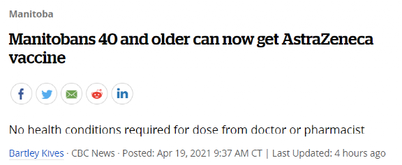 然后紧接着,CBC于4月19日报道,曼尼托巴省政府称,该省19日已把接种阿斯利康疫苗的最低年龄限制放低到40岁。安大略省和阿尔伯塔省也在同日官宣,这两个省将于4月20日实施相同的疫苗接种策略,把阿斯利康接种者的年龄限制放低到40岁。