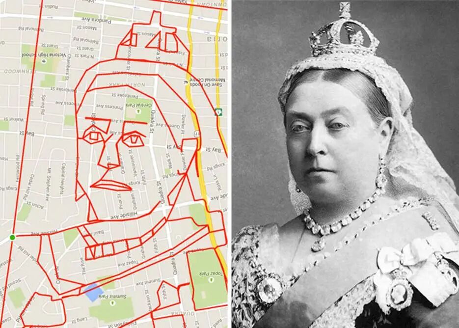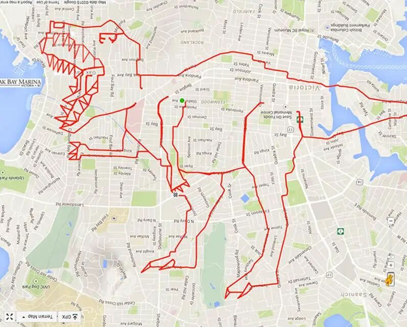其实,用Strava作画并不是最近才涌现出的艺术形式,加拿大就有很多Strava艺术的大咖,他们把街道当画布,用足迹当画笔,在地图上绘出一幅幅栩栩如生的涂鸦。