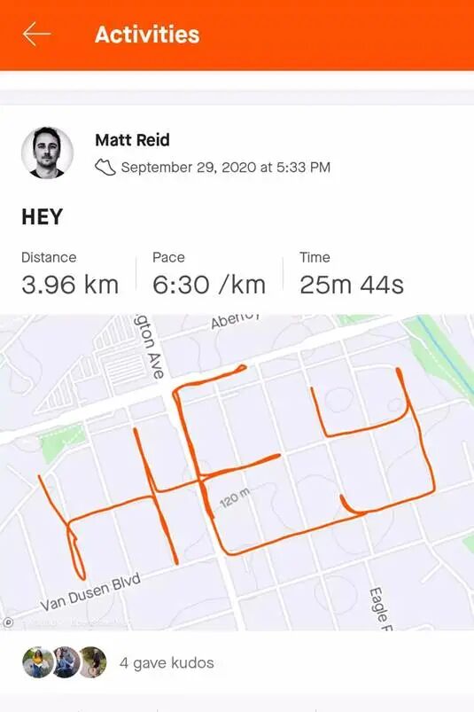 从去年疫情爆发以来,Reid便不再和朋友一起跑步,转而开始使用跑步应用程序Strava,用GPS记录下的跑步路线来作画,把枯燥的独自奔跑变为了让彼此开怀大笑的有趣游戏。