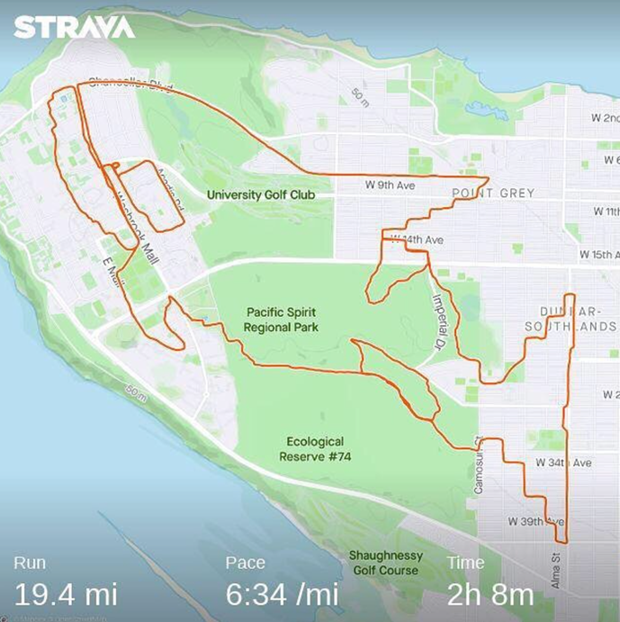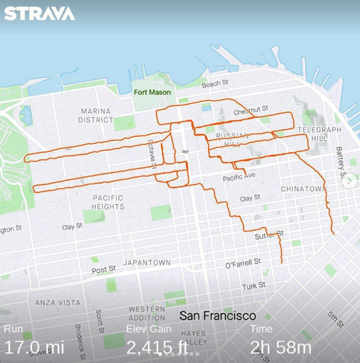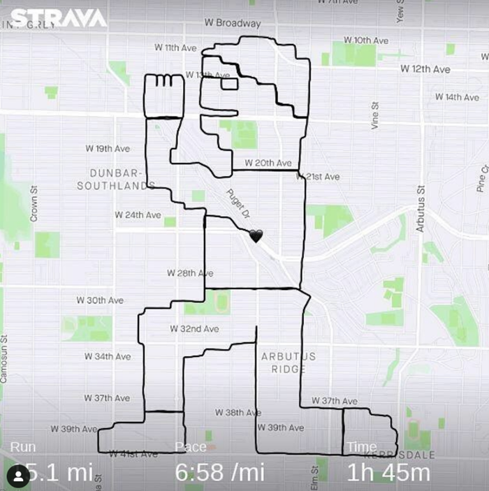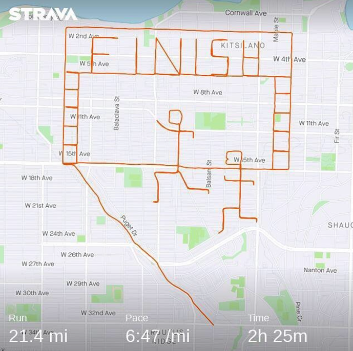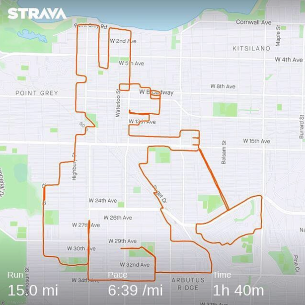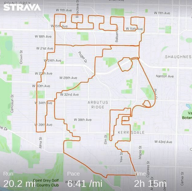 另一位温哥华马拉松运动员和跑步教练Tony Tomsich,因为疫情,只能独自跑步的他,也利用Strava进行奇妙的艺术创作,换一种方式来享受跑步的乐趣。