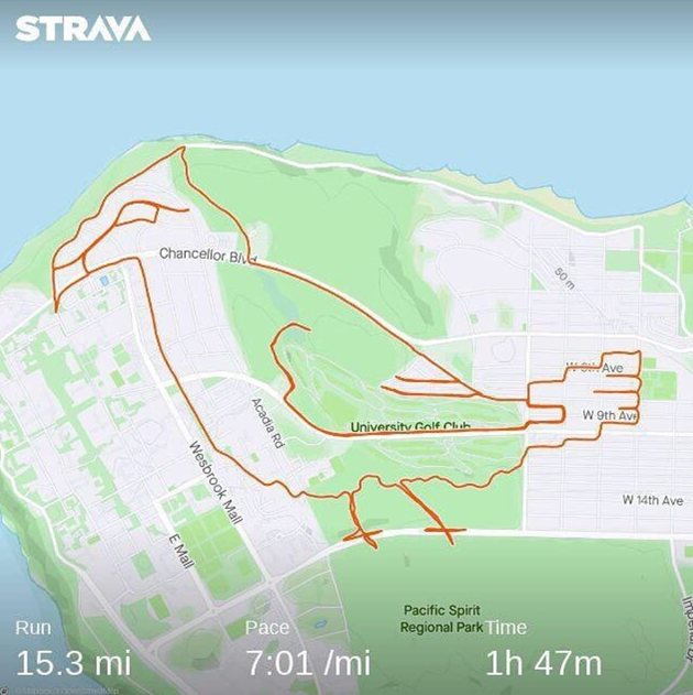 作为一名跑步教练,Tomsich一直花大量时间在Strava上观察其他人上传的跑步数据和路线,并从中发现了遍布温哥华各处的有趣道路和小径。