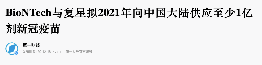 而据国内媒体公开报道,早在去年年底,BioNTech就与复星药业达成合作协议,一旦获中国相关方面批准,BioNTech预计将于2021年向中国大陆市场供应至少1亿剂BNT162 mRNA新冠核酸疫苗。