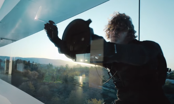 只见一个特供装扮的特工小伙偷偷潜入了苹果公司的大楼,然后用苹果的触控笔直接在大楼外墙玻璃上切出一个圈 (离谱)。