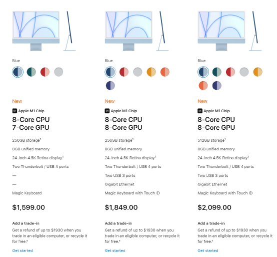 2021 iMac全系机型4月30日开始预订,5月下旬开始发售。按照苹果加拿大官网上的数据,最低配的iMac搭载8核处理器和7核显卡,有4种颜色,售价1599加元。