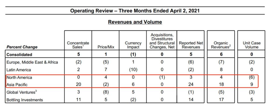 可口可乐区域销售变化百分比 图源:公司公告