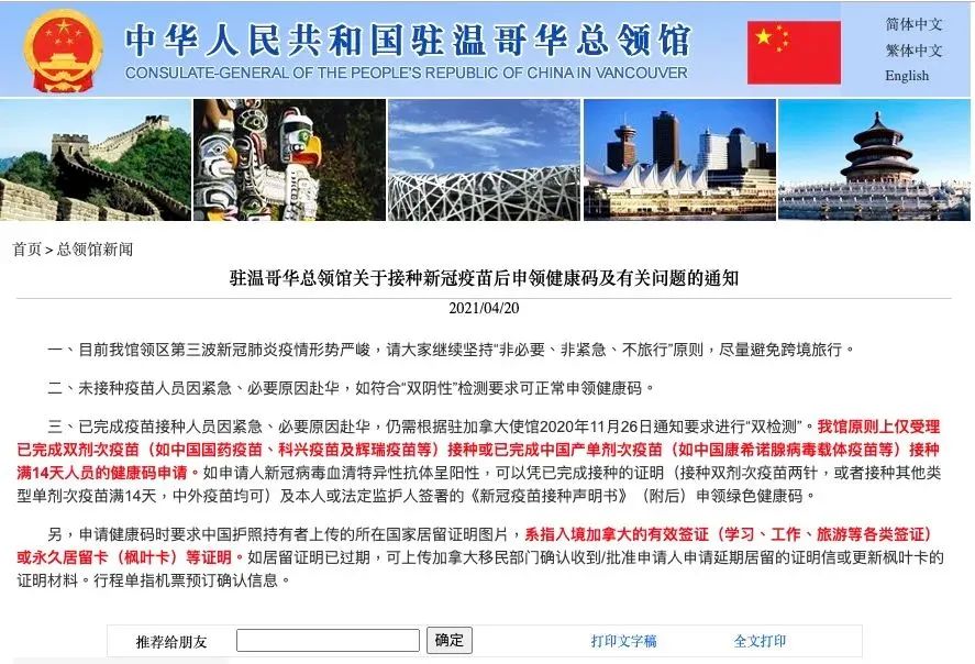 4月20日,中国驻温哥华总领馆发布了《关于接种新冠疫苗后申领健康码及有关问题的通知》,通知一发出,其中关于接种疫苗后回国的相关内容引起了华人的高度关注,社交媒体都在热议这个话题。