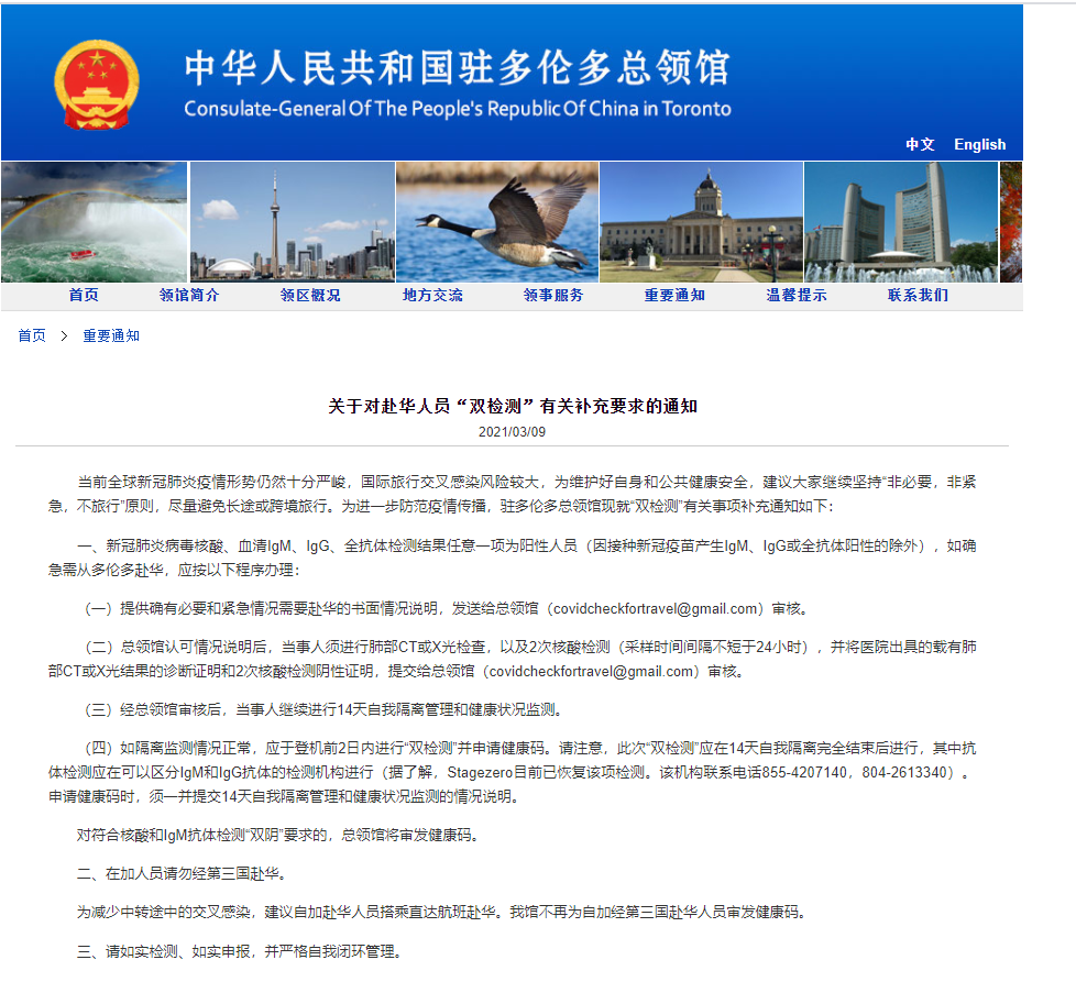 小编查阅了中国驻多伦多领事馆的网站,其中3月9日发布的《关于对赴华人员“双检测”有关补充要求的通知》明确了对于关于对检测中出现阳性的申请者,有进一步检测的规定。