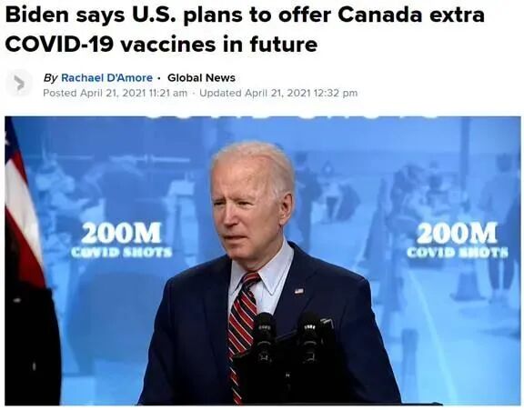 美国总统拜登4月21日宣布,再赠送加拿大2000万只牛津疫苗,这已经不是美国第一次向加拿大提供新冠疫苗援助。