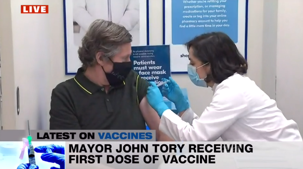 多伦多市长庄德利(John Tory)4月10 上午在多伦多一家药房也接种了第一剂阿斯利康疫苗。