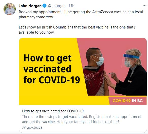 为了鼓励省民踊跃施打疫苗,特别是让人疑虑的阿斯利康疫苗,BC 省省长贺谨(John Horgan) 站出来做为表率,于4月15日(周四)发出推文,表示自己已预约药房打算4月16日接种阿斯利康疫苗。