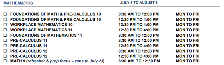10-12年级的数学课程:7月5日~8月6日周一至周五。