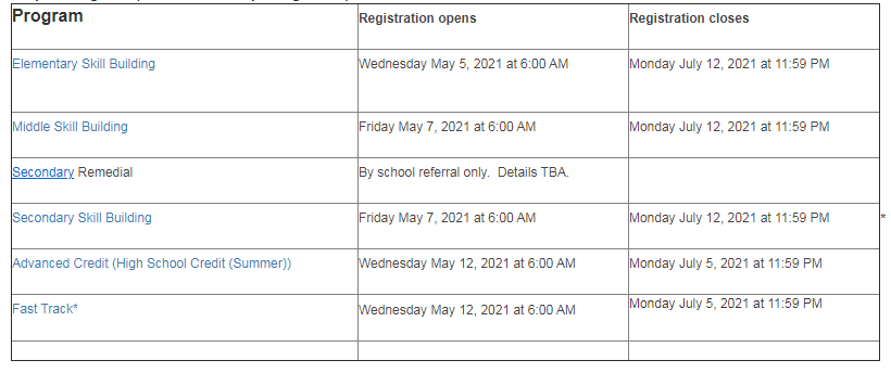 *在2021年6月30日之前完成幼儿园至6年级之间任何年级的学生都有资格参加小学暑期课程。