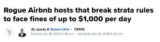 2018年7月18日起,BC省通过新条例,物业管理公司可禁止住户将房产进行短租。违反物业管理公司规定、擅自将民宅改成短租民宿,一天最高可罚款1000加元。