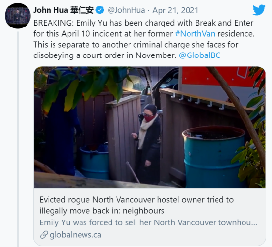 不过BC省最高法院才不管她怎么说,现在Yu女士身上又多了一条私闯民宅的指控。