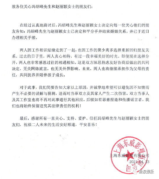 从这对的离婚中,我看到了成年人的体面2021-04-23 |作者: | 来源:新浪娱乐娱乐Loading...分享: 今日份爆炸新闻——冯绍峰赵丽颖官宣离婚。 相信大家也看到了。 今早10点整,冯绍峰赵丽颖两家工作室同时发布离婚声明,称两人因聚少离多的客观不可调和原因,已决定和平分手并结束婚姻关系。 消息一出,一片哗然。 吃瓜群众的第一反应,无疑是意外。毕竟两人近期有、且不止有过一次的同框与互动。 2021年2月,两人被爆同游三亚; 2021年3月,网友偶遇两人一起玩密室逃脱; 2021年4月,狗仔又拍到两人在餐厅聚餐; 前脚还如同正常夫妻一样生活、娱乐,可谁能想到,如今仅仅几天过去,两人就官宣了离婚。 即便是时刻冲在一线的吃瓜群众,都很难跟上如此闪电般的节奏。 但,其实相比意外和震惊,更多的还是佩服与祝福吧。以及这波大气的操作,还是值得点赞的。 消息公布后,赵丽颖方向新浪娱乐回应表示: “这是丽颖峰哥友好协商后的共同决定,我们尊重他们的决定,之后两人会继续承担作为父母的责任。这个事情我们之后不作回应,谢谢大家的关心。” 稍晚,两人也再次发博互相喊话和祝福对方。 直接跳过来来回回的传闻和不断否认的拉锯战,干脆利落地官宣。 双方工作室的声明直接了当,且选在工作日的上午官宣,当事人的回应和祝福也是大大方方。 不带节奏,不掩饰,不暗示,不占过多公共资源,同时体谅媒体同仁。 不管从哪个角度想,这对都能算得上是娱乐圈夫妻好聚好散的典范。 回顾两人恩爱过去,甜蜜瞬间好像都还历历在目。 长时间在剧组拍戏的男女主,很容易日久生情,冯绍峰赵丽颖这对也是如此。 2016年12月,两人进组拍摄《西游记女儿国》。拍摄期间嬉笑、打闹,毫不避讳镜头,那时的他们,就已经满满的小粉红。 拍完《西游记女儿国》后,两人又合作了《知否》。 在剧组时,又是一波又一波地发糖。 后来戏是拍完了,但两人的小粉红依旧没有停止。 私下被拍,穿着情侣装↓ 被偶遇,高糊也挡不住的甜↓ 还被爆料去看房,时刻都是手牵手↓ 那段时间,两人虽一直未正面承认关系,但交往一事也早已被吃瓜群众默认和祝福。 恋情发展到2018年年底,两人又好像摁下了加速键,跳过官宣恋情,直接就是官宣结婚、官宣怀孕,官宣生子。 2018年10月16日,官宣结婚; 2019年的第一天,官宣怀孕; 后来到2019年的3月8日,冯绍峰又发文官宣赵丽颖产下一子; 结婚生子后,两人越来越高调,合影、互cue不说,更是隔段时间就会大方地撒把狗粮。 赵丽颖会晒两人一起庆祝生日的照片↓ 还会晒男友视角照片,很是甜蜜↓ 而冯绍峰这边,当年拍《知否》接受我浪采访时,记者每次cue赵丽颖,他嘴边都会不自觉地露出微笑。 “她背台词我就在旁边踱步,反正她也不理我” “有我在她拍戏都比较稳当” “赵老师唱歌比我好” …… 后来上阿雅的节目,也总 是情不自禁地把赵丽颖挂在嘴边。 感觉太惬意,后悔没有叫赵丽颖一起来→“这期应该让我老婆跟我一起来,亏了。” 冯绍峰总是患得患失,反反复复问赵丽颖→“我有时候问她,你到底是真的喜欢我呢,还是为了结婚才跟我在一起。” 冯绍峰拍戏辛苦,回家就哭,而赵丽颖则是静静地看着他,等他哭完才去耐心哄劝→“我老婆就静静看着我,哭完了她说你看看孩子吧。” 这个节目里,冯绍峰完全就是撒娇老公,而赵丽颖完全就是傲娇老婆的形象,以至于那会儿很多人还调侃两人像是拿反了剧本。 从传绯闻时的各种小粉红,到后来的大方秀恩爱,曾经的他们,也是令人羡慕的一对。 但令人不解的是如此恩爱两人,为什么到头来会选择离婚? 从双方工作室的声明中可以看到,原因是聚少离多。 那么,我们来看看两人的行程。 已知两人是因戏生情,曾合作过《西游记女儿国》与《知否》。 《西游记女儿国》是2016年11月开机,拍摄周期大概4个半月。《知否》是2017年9月开机,拍摄周期大概5个多月。 从2018年开始,两人疯狂传绯闻,接着官宣结婚,到2019年孩子出生,这一段时间两人的糖分很多。 但之后,取而代之的却是忙碌的行程。 赵丽颖这边—— 2019年9月到2020年4月,赵丽颖进组拍摄《有翡》。而在拍摄完《谁是凶手》之后,她又无缝衔接开始拍摄《幸福到万家》。 今年3月,《理想照耀中国》之《希望的田野》又刚刚开机。 期间还有各种综艺、广告等等大小通告,行程非常忙碌。 而冯绍峰这边—— 电视剧《大时代》是2019年8月杀青,拍摄周期4个多月。2020年7月,《检察风云》开机,又历经2个月杀青。 之后冯绍峰进组拍摄《九州朱颜记》,从2020年10月直接拍到2021年2月,后面又跟着一部《爱犬奇缘》。 同样是前不久,《理想照耀中国》之《光芒》也才刚刚开机。 除戏外,冯绍峰也还有各种活动通告,以及不少客串戏份,同样是无缝进组的节奏。 从2019年年底到如今,这俩人是一个比一个忙。 普通人尚且会面临工作忙碌、夫妻异地等问题,更何况是需要到处跑通告,一进组就要驻扎许久的明星。 明星夫妻因聚少离多,导致缺少陪伴感情变淡,当然,也是不难理解的。 与其大面积猜测两人为何会离婚,还不如来分析下两人的感情观。其实两人对待感情,都很成熟。 曾经的冯绍峰,也经历过飞蛾扑火和不顾一切。但随着阅历和经验的累积,他越发觉得人与人之间的相处是一种缘分。 现在的他只觉得感情越是平淡,越是长久。因为激情燃烧完之后,剩下的温馨与简单才