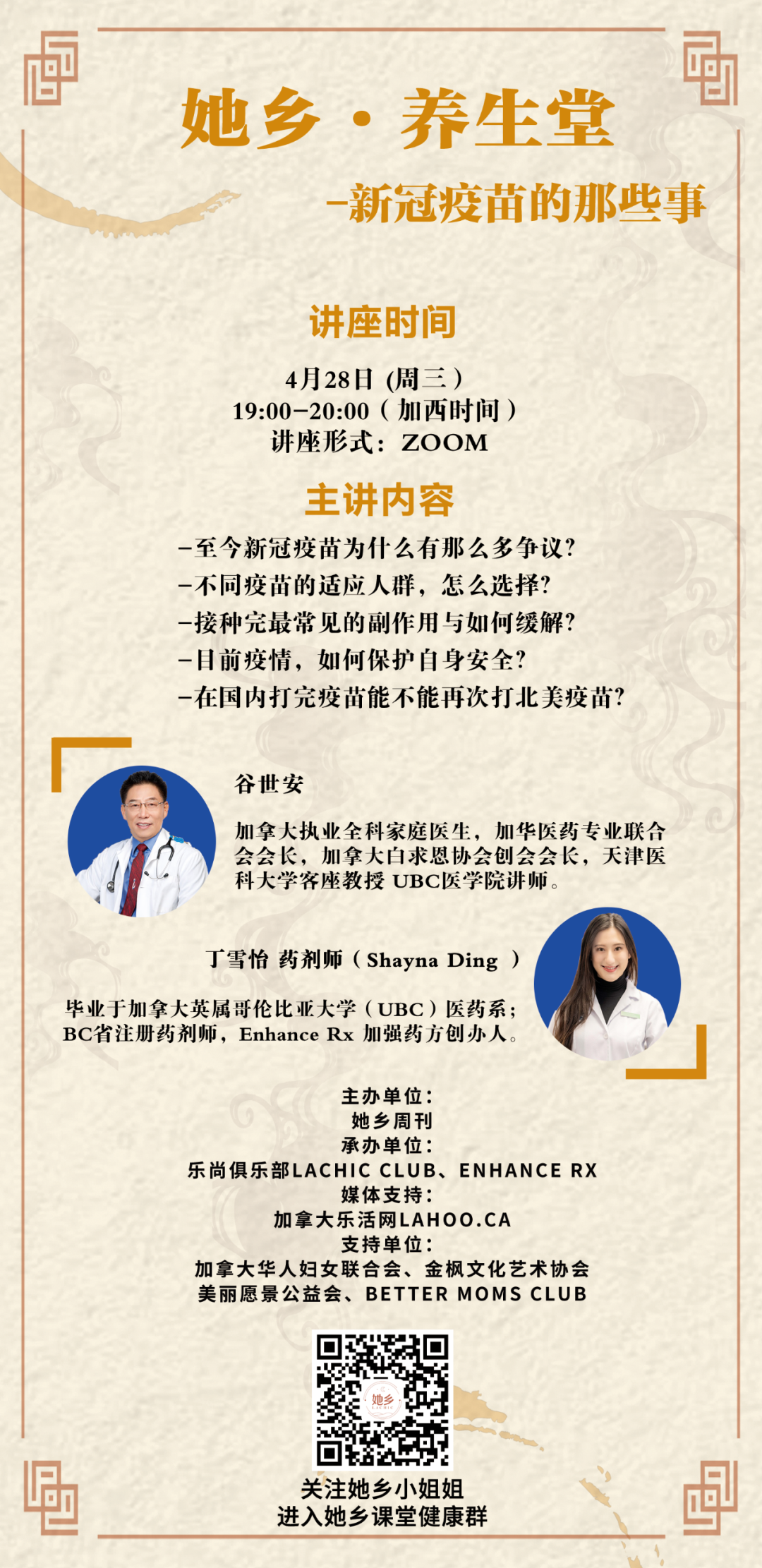 大家最关心的新冠疫苗的种种问题,来自四面八方的信息让我们应接不暇,到底哪些才是权威可靠的正确答案?“她乡养生堂”特邀两位医学专家,4月28日 19:00-20:00 隆重推出“新冠疫苗的那些事”专题讲座,敬请关注。