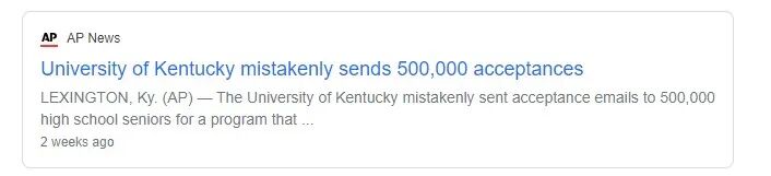 美国肯塔基大学就一口气发错50万张大学录取通知书。肯塔基大学还在录取通知书上写着:“我们很高兴地通知您,您已被肯塔基大学健康科学学院的选择性临床和管理课程录取。”