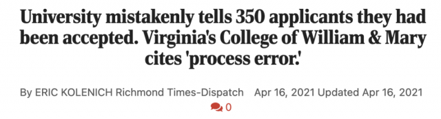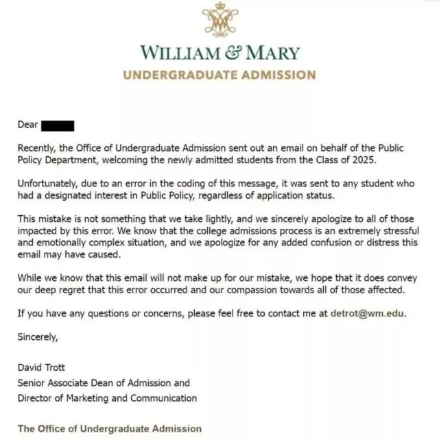 肯塔基大学发错录取通知书的风波还没消停,美国威廉玛丽学院已接棒上场。大约350名已经被拒绝或列入wait list的申请者,“惊喜”地接到了offer,本应该庆祝的他们,却开心不起来:因为第二天,学校就把offer收回了并把这次乌龙归咎于“process error”。真的是搞人心态啊!