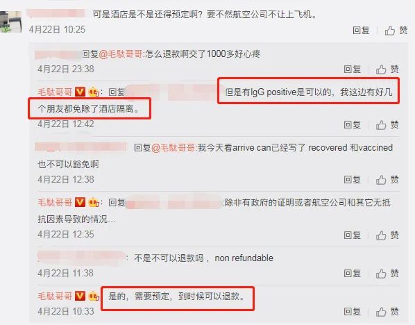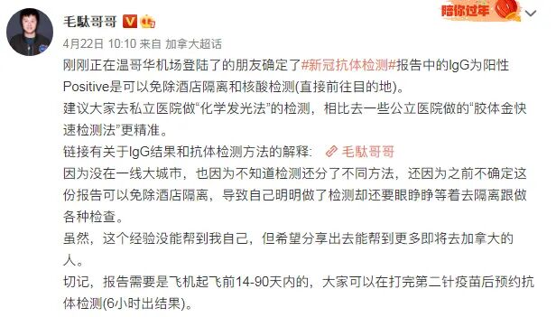 微博博主@毛駄哥哥发博称“刚刚正在温哥华机场登陆了的朋友,确定了新冠抗体检测报告中的lgG为阳性Positive,是可以免除酒店隔离和核酸检测(直接前往目的地)。”