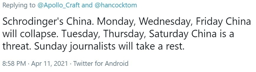 薛定谔的中国。周一、周三、周五,中国要毁灭了。周二周四周六,中国是个威胁。周日,记者要休息一下。