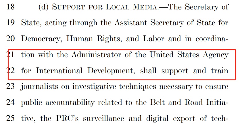 “2021年战略竞争法”还规定,美国助理国务卿应同美国国际开发署署长(USAID)协调,支持和培训记者使用必要的调查技术,确保他们能够加大对中国“一带一路”的“调查”。