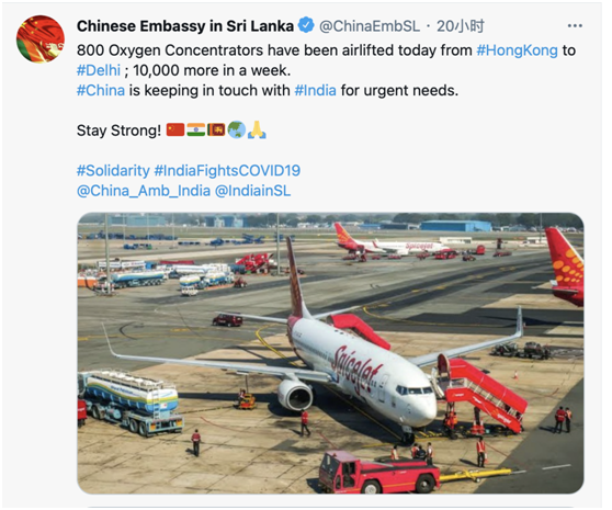 中国驻斯里兰卡大使馆26日在推文中写道:“800台制氧机今日从香港空运至德里,一周内还会再有10000台。中国正就(印度的)紧迫需求与印度保持联系。要坚强!”