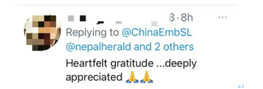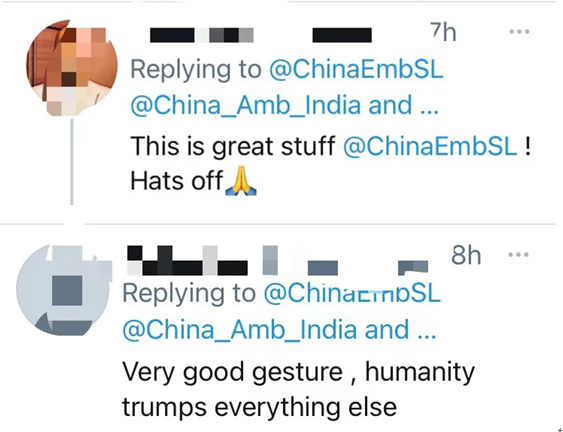 在大使馆的这条推文下,不少印度网民热情留言,对中国表示感谢:“衷心的感谢……深深的感激”、“这东西很棒!脱帽致敬”、“很好的动作,人性超越一切”↓