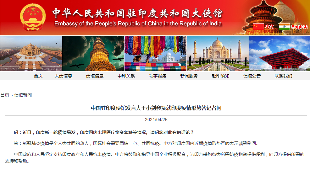 驻印度使馆发言人:将鼓励和指导中国企业积极配合,为印方采购防疫物资提供便利