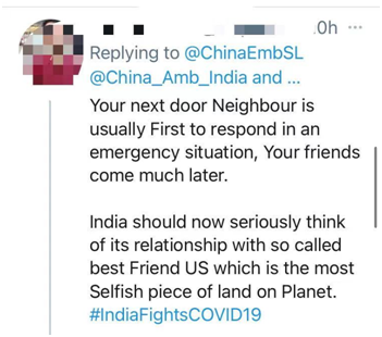 还有网友感慨“远亲不如近邻”:“在你遭遇紧急状况时,你的邻居通常是第一个伸出援手的,你的朋友反而要来得晚。印度应该认真想想和所谓的‘最好的朋友’美国的关系了,这是地球上最自私的国家。”↓
