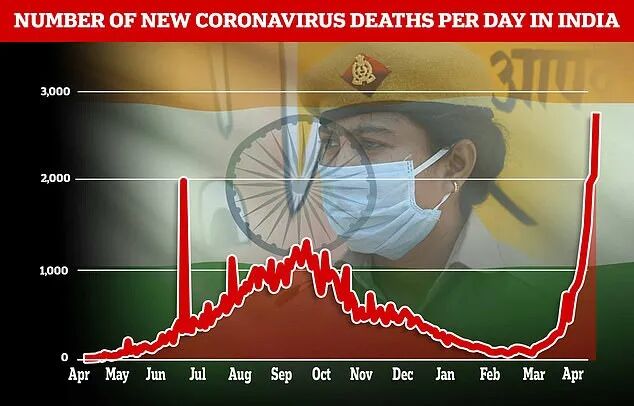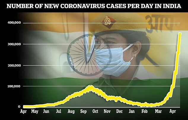 4月25日,印度总理纳伦德拉·莫迪(Narendra Modi)敦促所有公民接种疫苗并保持谨慎,同时医院和医生发布了紧急通知,称他们无法应对蜂拥而来的病人。