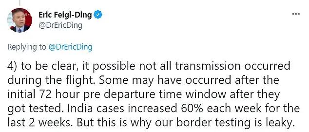 美国科学家联合会(Federation of American Scientists)的流行病学家埃里克·费格尔-丁(Eric Feigl-Ding)在推特上表示,在该航班上的乘客落地实施隔离之前,仅发现了八例病例;其余病例是在乘客们在酒店进行隔离期间发现的。