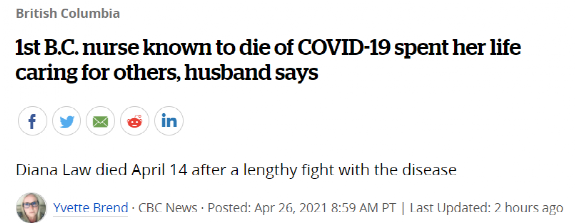 Law女士是BC省首个死于新冠病毒的护士,而在加拿大,像她这样的牺牲者还有49人。Culshaw先生对CBC表示,Law女士一定是在白石和平门医院染上的新冠病毒,且在她患病前,打疫苗这种好事,还根本轮不到医护工作者。