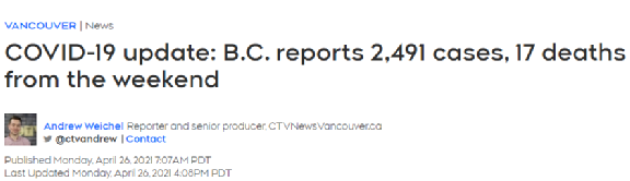 【加拿大乐活网lahoo.ca 程序综述】4月26日,BC省在过去72小时新增新冠感染病例2491例,另有17人死亡。截至26日,BC省已为160万省民至少接种了第一剂新冠疫苗,约占本省总人口的3分之1。