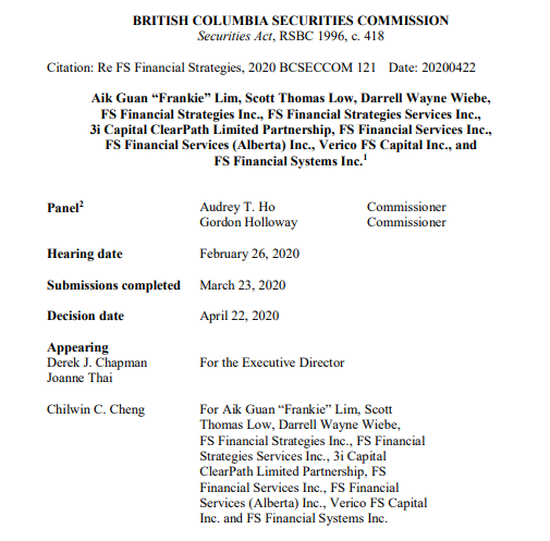 2020年4月22日,BCSC对整个FS集团开出了3280万美元的天价罚单,勒令该集团的创始人Aik Guan “Frankie” Lim和Scott Thomas Low分别支付200万加元,并永远禁止他们踏足BC省投资市场。