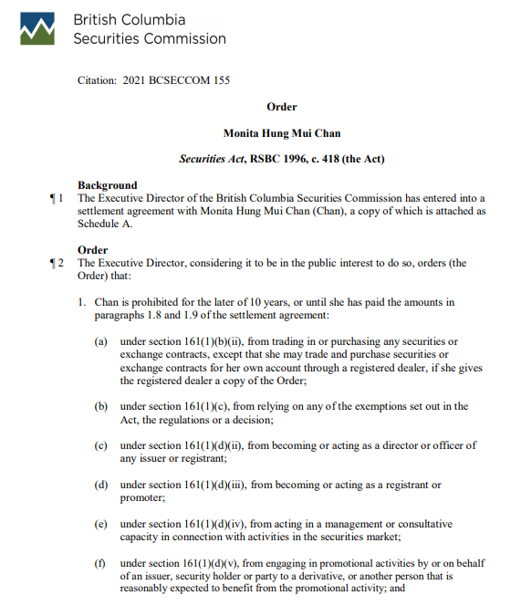 (BCSC对Chan某的判罚书 图自BCSC)
