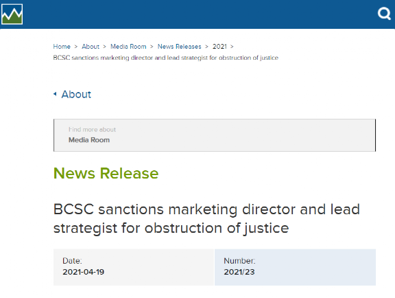 BCSC称,此二人对政府执法部门隐瞒或藏匿了必要信息,妨碍了司法公正。因此,该部门决定对两人一共罚款70,000加元(其中Zhang某4万加元、Wang某3万加元),并禁止Zhang某在3年、Wang某在2年内从事证券市场相关的管理或咨询活动。