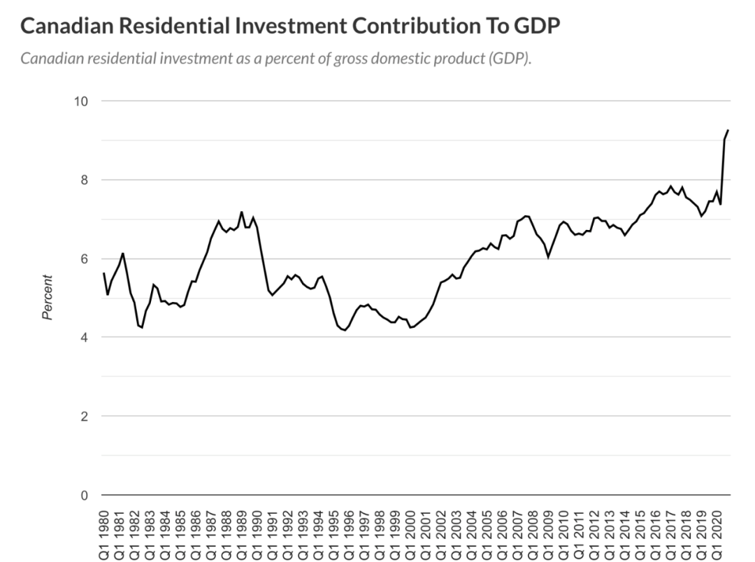 数据显示,截至2020年4季度,加拿大住宅投资占GDP比例达到创历史纪录的9.3%,同比2019年四季度的7.5%暴增1.8%。