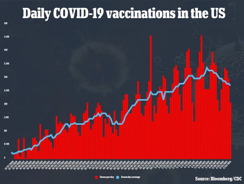 截至周二(4月27日),有约29%任何年龄段的美国人接种了2剂COVID-19疫苗,42.5%的美国人注射了第一剂。