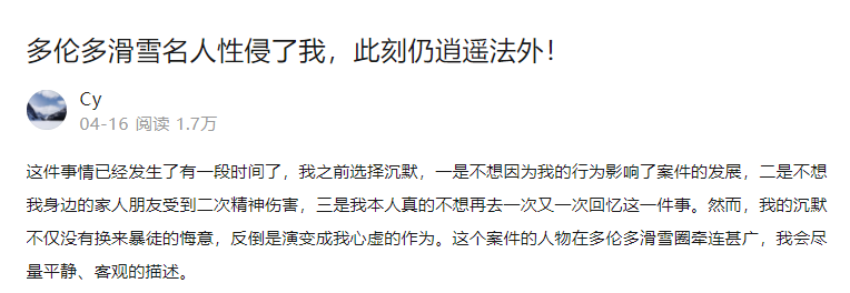 两个星期前,一个周六的晚上,朋友发了一篇文章让我看看,就是这篇多伦多女孩的个人经历《多伦多滑雪名人性侵了我,此刻依然逍遥法外》。