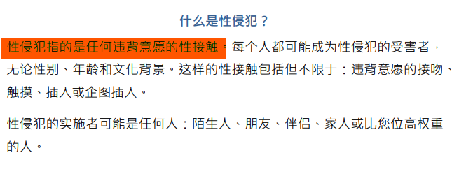 对于什么是性侵,多伦多警察局发布的一份《性侵犯受害者服务指南》中明确写道:性侵犯是指任何违背意愿的性接触。