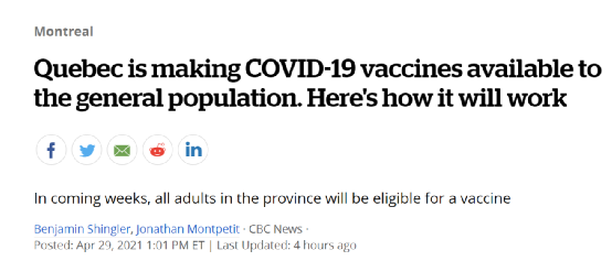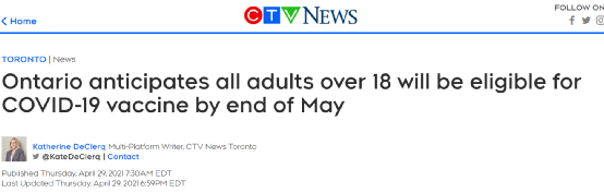 此外,据CTV News报道,安大略省政府4月30日也将允许所有55岁以上的省民预约接种新冠疫苗,且希望在5月底开始为所有18岁以上的成年人完成疫苗接种预约。